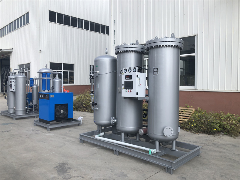 變壓吸附制氧裝置以潔凈的壓縮空氣為原料,采用高品質的沸石分子篩作為吸附劑,在一定的壓力下,從空氣中制取氧氣。經過純化干燥的壓縮空氣,在吸附器中進行加壓吸附、減壓脫附。由于空氣動力學效應,氮在沸石分子篩微孔中擴散速率遠大于氧,氮被沸石分子篩優(yōu)先吸附,氧在氣相中被富集起來,形成成品氧氣。然后經減壓至常壓,吸附劑脫附所吸附的氮氣等雜質,實現(xiàn)再生。一般在系統(tǒng)中設置兩個吸附塔,一塔吸附產氧,另一塔脫附再生,通過PLC程序控制器控制氣動閥的啟閉,使兩塔交替循環(huán),從而取得純度較高的氧氣(93%±3%)。