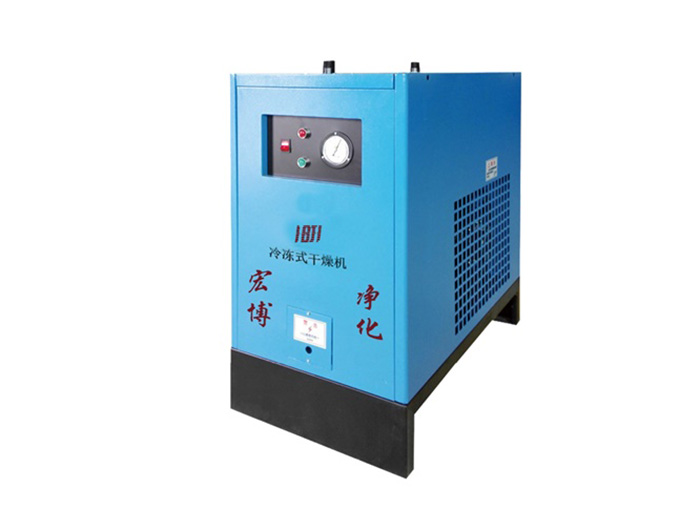 冷凍式干燥機是壓縮空氣后處理系統(tǒng)中使用較普遍的干燥設(shè)備,它利用濕空氣在壓力不變的情況下含濕量歲溫度降低而減少的原理,運用制冷技術(shù)是壓縮空氣溫度降低,迫使其中的水蒸氣冷凝成液態(tài)水排出機外,然后在將脫水后的壓縮空氣升溫至接近環(huán)境溫度,從而在冷干機排氣口獲得露點和相對濕度都較低的干燥壓縮空氣。